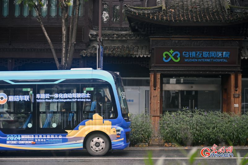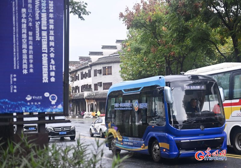 2024年11月17日,浙江乌镇,路上行驶的车路云一体化自动驾驶巴士。(光明网记者 潘迪摄/光明图片)