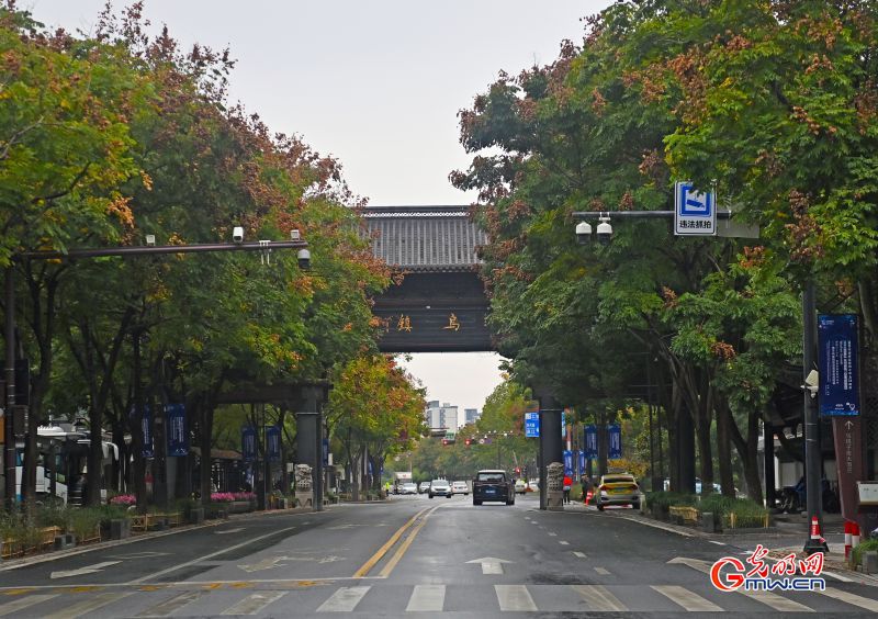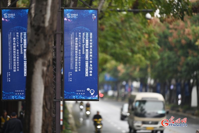 2024年11月17日,浙江乌镇,道路两旁已悬挂起2024年世界互联网大会乌镇峰会宣传道旗。(光明网记者 潘迪摄/光明图片)