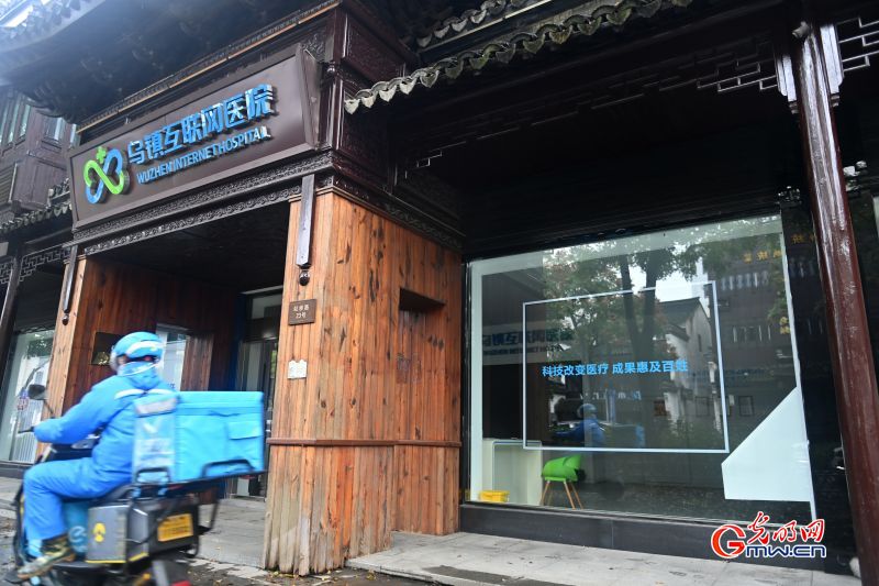 2024年11月17日,浙江乌镇,外卖骑手从乌镇互联网医院门前经过。(光明网记者 潘迪摄/光明图片)
