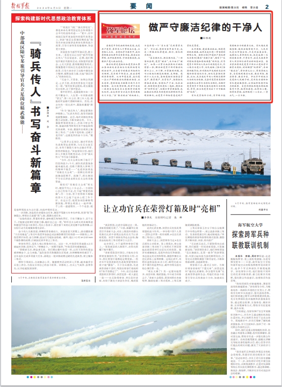 清廉是中华民族的传统美德,也是共产党员、革命军人干事创业之基、立身做人之本。在党纪学习教育中,我们要将廉洁纪律作为重要内容,厘清公私界限、筑牢抵腐防线、守好清廉底线,永葆共产党人政治本色。