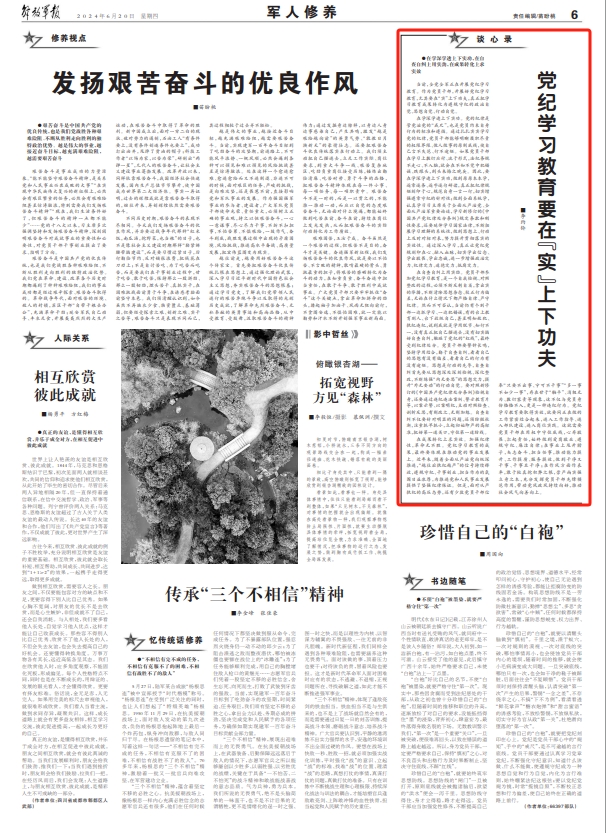 当前,全党全军正在开展党纪学习教育。作为党员干部,开展好党纪学习教育,尤其要在“实”上下功夫,真正把学习教育成果转化为遵规守纪的政治自觉、思想自觉、行动自觉。