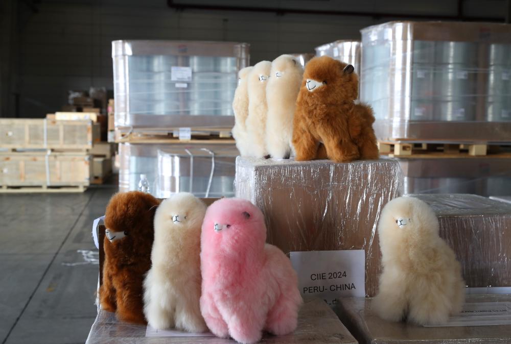 10月14日拍摄的运抵中远海运自有仓库的“温暖驼”产品。当日,中远海运承运的第七届进博会海运首单展品秘鲁“温暖驼”系列产品由洋山港码头运抵中远海运自有仓库,随后改换短驳厢式车送往客户公司。新华社记者 方喆 摄