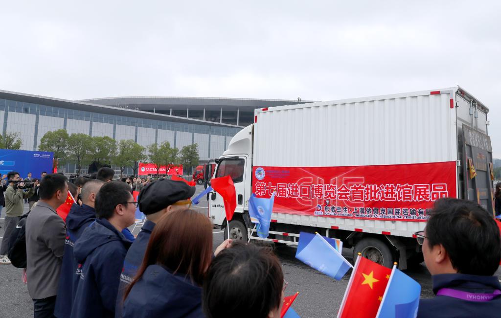 10月22日,装载首批进馆展品的卡车驶入仪式现场。当日,第七届中国国际进口博览会首批展品进馆仪式在国家会展中心(上海)举行。新华社记者 方喆 摄