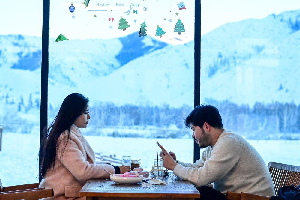 在新疆阿勒泰地区富蕴县可可托海镇塔拉特村,游客在一家咖啡厅内休憩(2023年12月22日摄)。新华社记者 丁磊 摄