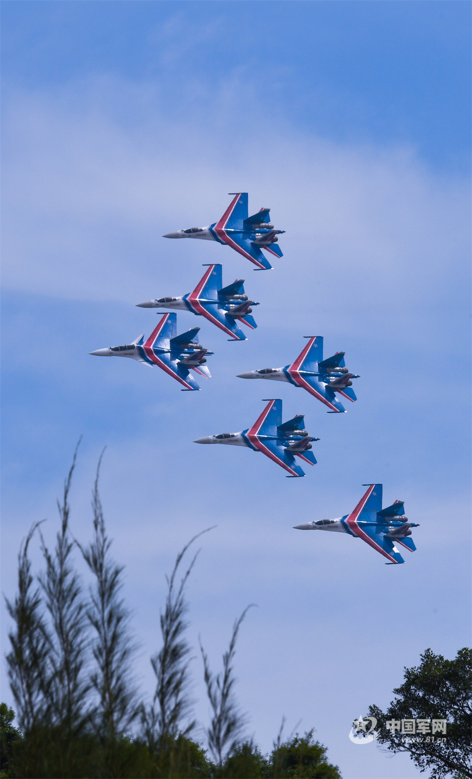 11月9日,全新换装苏-35S重型战斗机的俄罗斯“勇士”飞行表演队,以6机编队的形式,参加来到珠海后的首次适应性飞行训练。解放军报记者 栾铖 摄