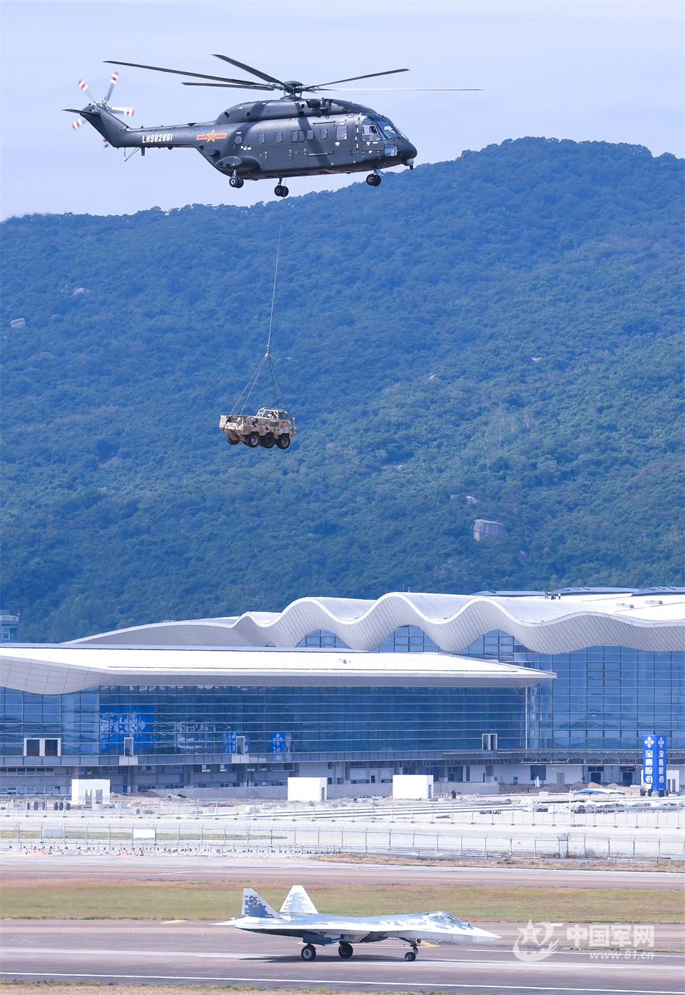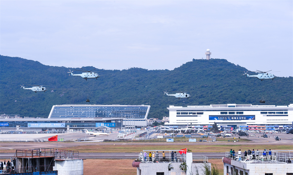 11月9日,来自海军的直-20舰载型、直-8C直升机,进行了航展前的适应性飞行训练。解放军报记者 栾铖 摄