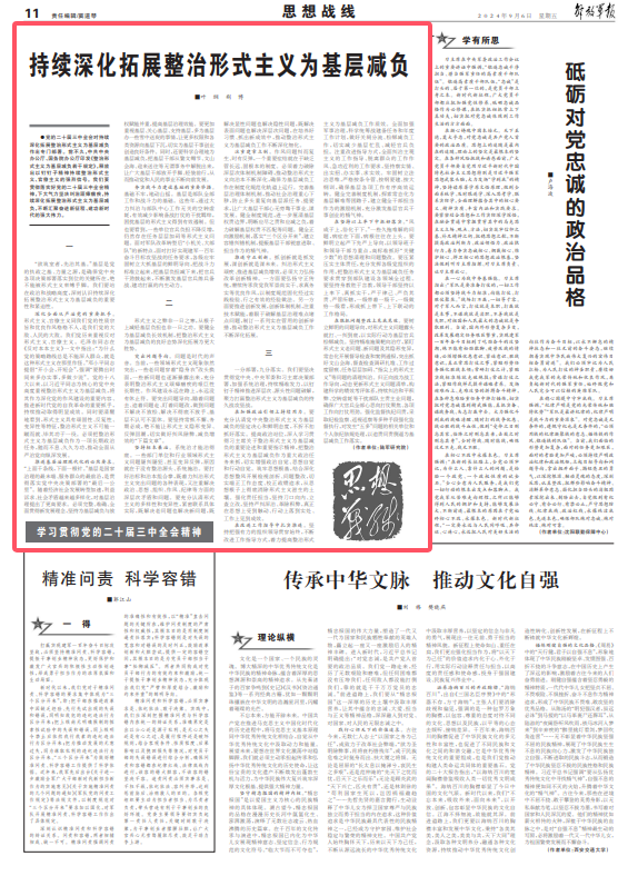 ●党的二十届三中全会对持续深化拓展整治形式主义为基层减负作出专门部署。前不久,中共中央办公厅、国务院办公厅印发《整治形式主义为基层减负若干规定》,释放出以钉钉子精神持续整治形式主义、官僚主义的强烈信号。我们要贯彻落实好党的二十届三中全会精神,下大气力坚决纠治顽瘴痼疾,持续深化拓展整治形式主义为基层减负,不断汇聚奋进新征程、建功新时代的强大伟力。