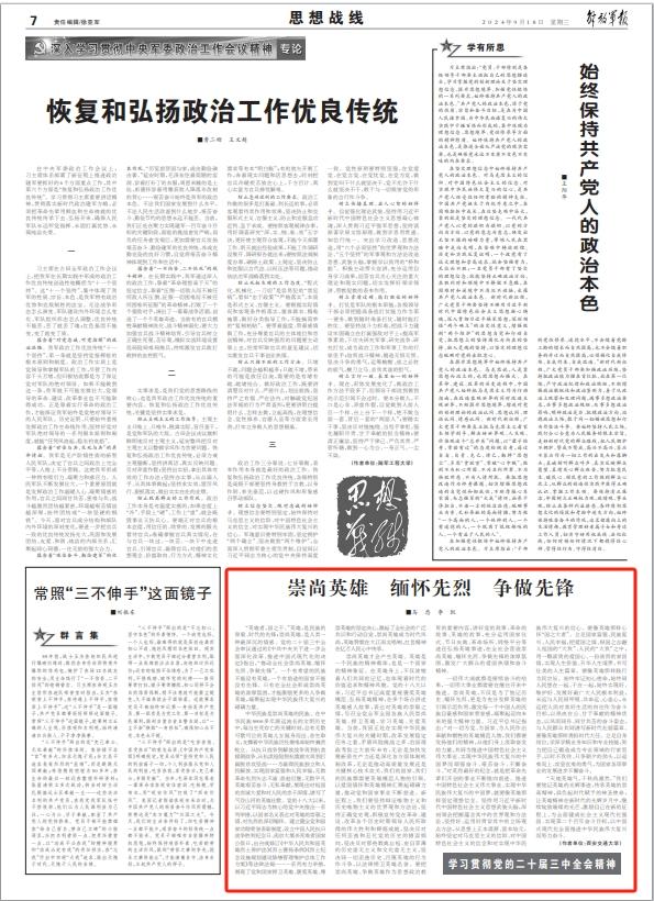 “英雄者,国之干。”英雄,是民族的脊梁、时代的先锋;崇尚英雄,是人类一种最深沉的情感。党的二十届三中全会审议通过的《中共中央关于进一步全面深化改革、推进中国式现代化的决定》指出,“推动全社会崇尚英雄、缅怀先烈、争做先锋”。一个有希望的民族不能没有英雄,一个有前途的国家不能没有先锋。只有在全社会形成崇尚英雄的浓厚氛围,才能激励更多的人争做英雄,凝聚起实现中华民族伟大复兴的磅礴力量。