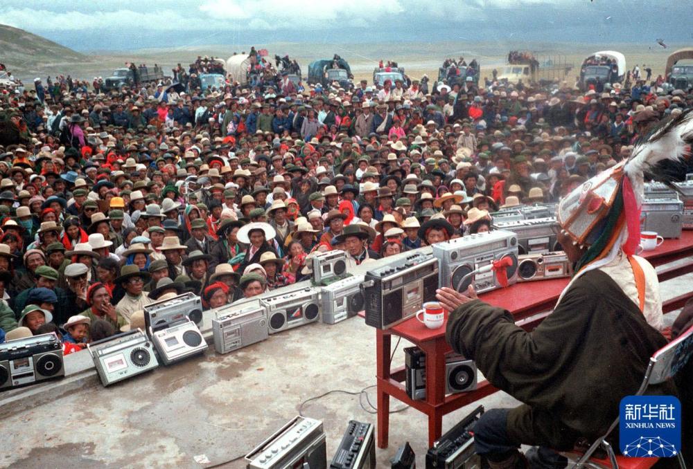 1984年,西藏说书艺人说唱《格萨尔王传》,牧民用各种型号的录音机录下这动人的故事。新华社记者 才龙 摄