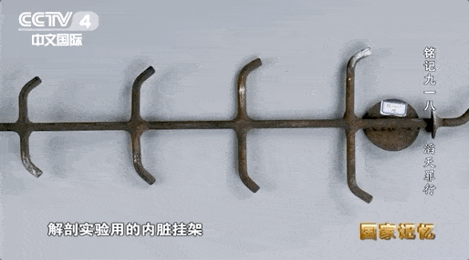 七三一部队遗址出土的解剖实验用的人体内脏挂架、剃刀和浸泡人体内脏的标本瓶。
