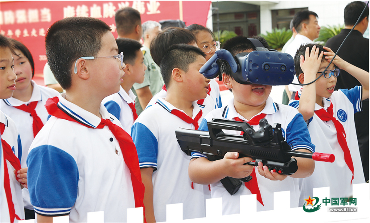 9月19日,在浙江省国防教育成果展上,小学生戴上VR设备体验模拟射击。黄 超摄