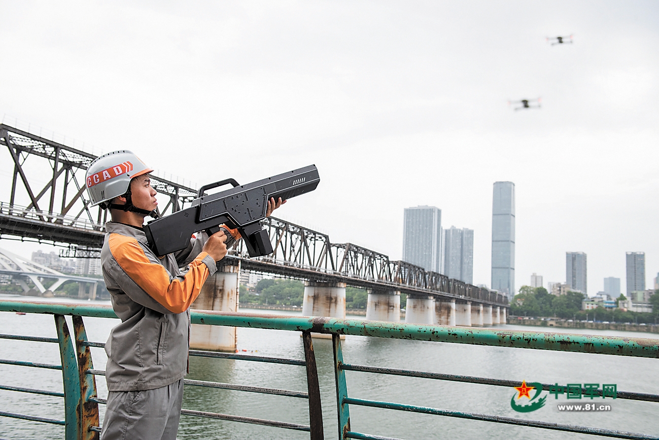 广西国动办联合有关部门组织铁路桥梁防护救援训练。图为参训人员运用防护设备,防范无人飞行器对桥梁进行攻击。陈 喜摄