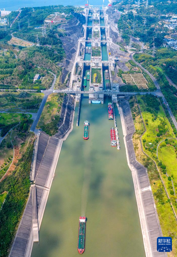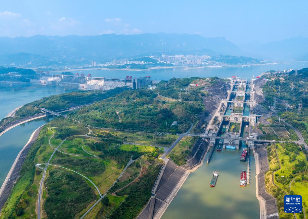 9月10日,在湖北省宜昌市,船舶有序通过三峡枢纽双线五级船闸(无人机照片)。