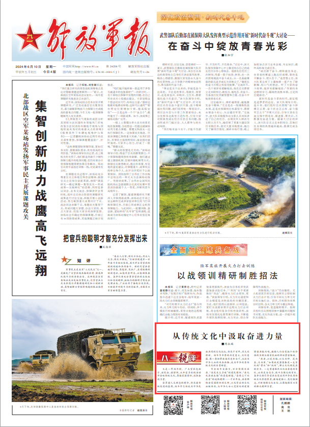 “兵者,以武为植,以文为种。武为表,文为里。”如果说武器装备是一支军队的“骨头”和“肌肉”,那么文化则是其软实力。一支有着强烈文化自豪感的军队,必然是自信力、战斗力强大的军队。各单位要引导官兵自觉运用中华优秀传统文化养德修身,激扬爱国心、笃定报国志,不断增强文化自信,汇聚起强军兴军的强大精神力量。