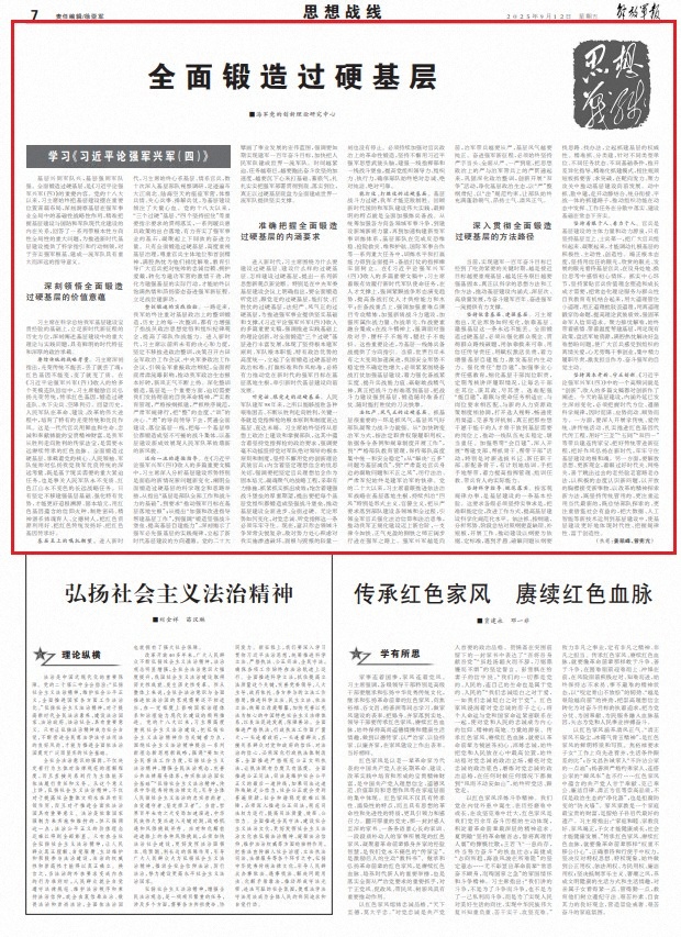 进入新时代,习主席围绕为什么要建设过硬基层、建设什么样的过硬基层、怎样建设过硬基层,提出一系列新思想新观点新论断。特别是在中央军委基层建设会议上明确指出,要全面锻造听党话、跟党走的过硬基层,能打仗、打胜仗的过硬基层,法纪严、风气正的过硬基层,为推进强军事业提供坚实基础和支撑。《习近平论强军兴军(四)》收入的多篇重要文稿,强调推进实践基础上的理论创新,对全面锻造“三个过硬”基层进行丰富发展,体现了坚持根本建军原则、军队根本职能、特有政治优势的高度统一,立起了全面锻造过硬基层的政治标准、打赢标准和作风标准,必将有力推动党在新时代的强军目标在基层落地生根,牵引新时代基层建设向前发展。