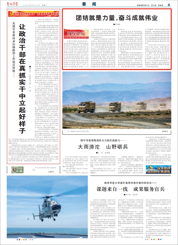 “积力之所举,则无不胜也;众智之所为,则无不成也。”各级应锚定实现建军一百年奋斗目标,鼓足团结奋斗的精气神,凝聚“想在一起”的团结之心,激发“干在一起”的奋斗之力,人人知责于心、担责于身、履责于行,个个全力投入、全力以赴、全力出击,在党的旗帜下团结成“一块坚硬的钢铁”,齐心协力为强军事业艰苦奋斗、顽强奋斗、不懈奋斗,把我们党领导的英雄军队锻造得更加坚强,续写英雄人民军队的浴血荣光。