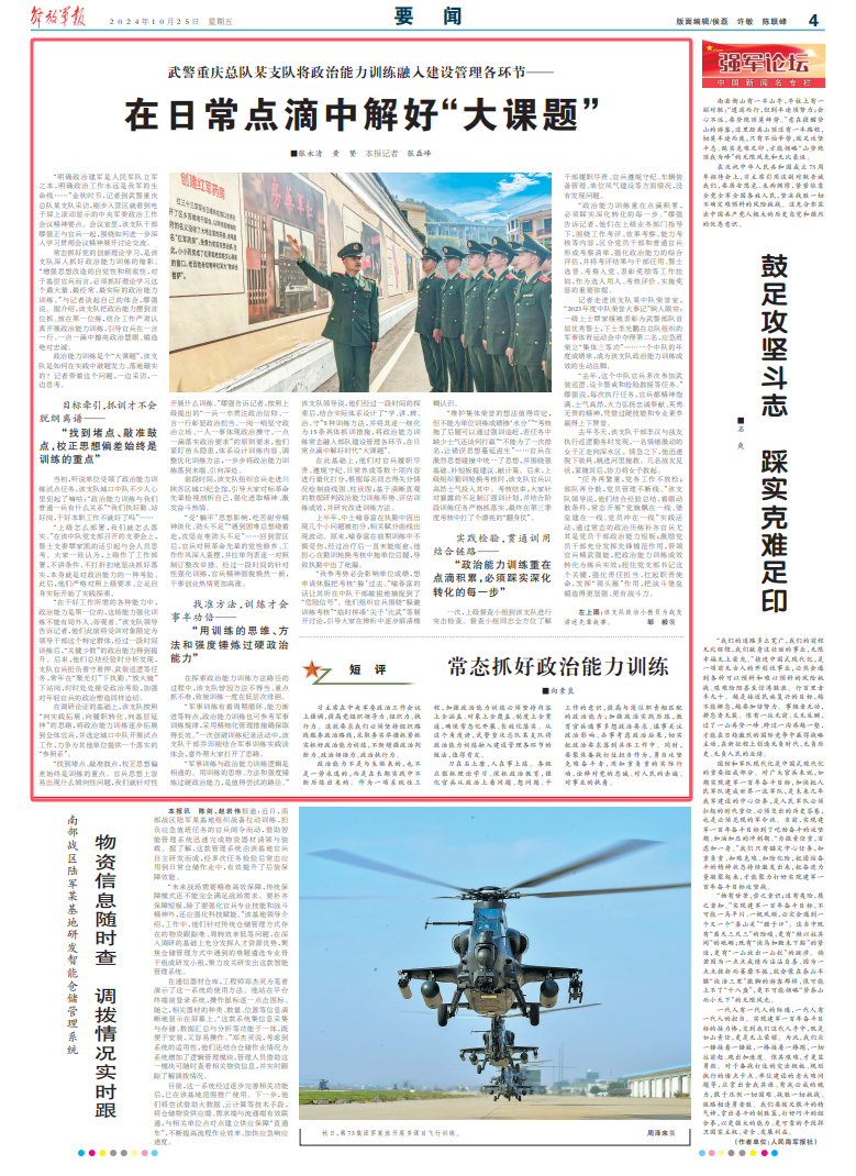 刀在石上磨,人在事上练。各级应狠抓理论学习、深抓政治教育,强化官兵从政治上看问题、想问题、干工作的意识,提高与岗位职责相匹配的政治能力;加强政治实践历练,教育官兵遇事多想政治要求、谋事关注政治影响、办事考虑政治后果,切实把政治要求落到具体工作中。同时,要聚焦备战打仗担当作为,勇当攻坚克难奋斗者,用知重负重的实际行动,诠释对党的忠诚、对人民的赤诚、对事业的执着。