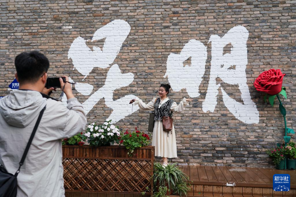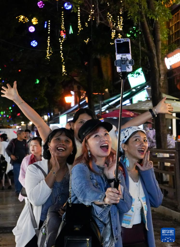 游客在文明街上合影留念(5月8日摄)。新华社记者 王静颐 摄