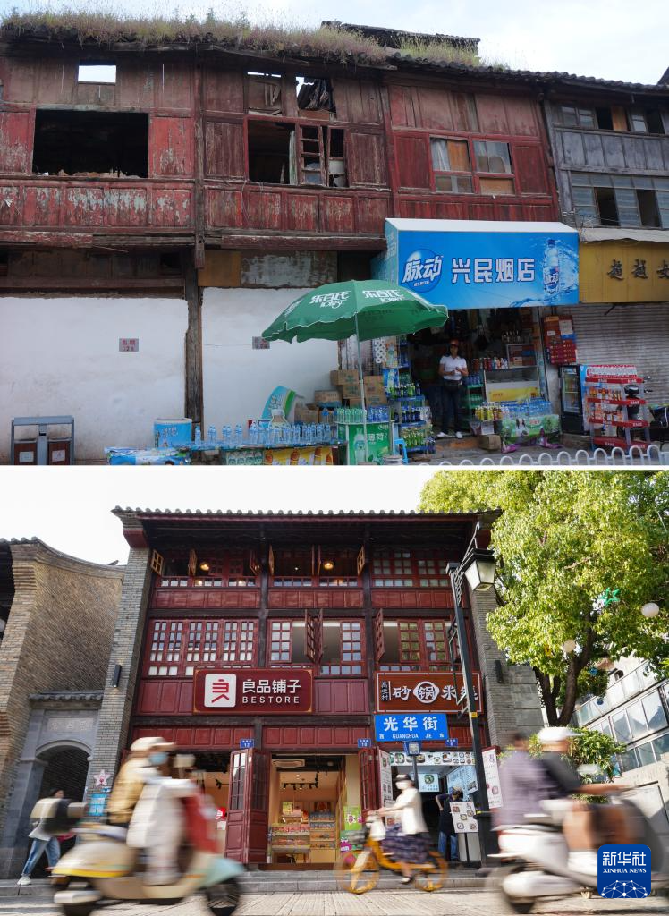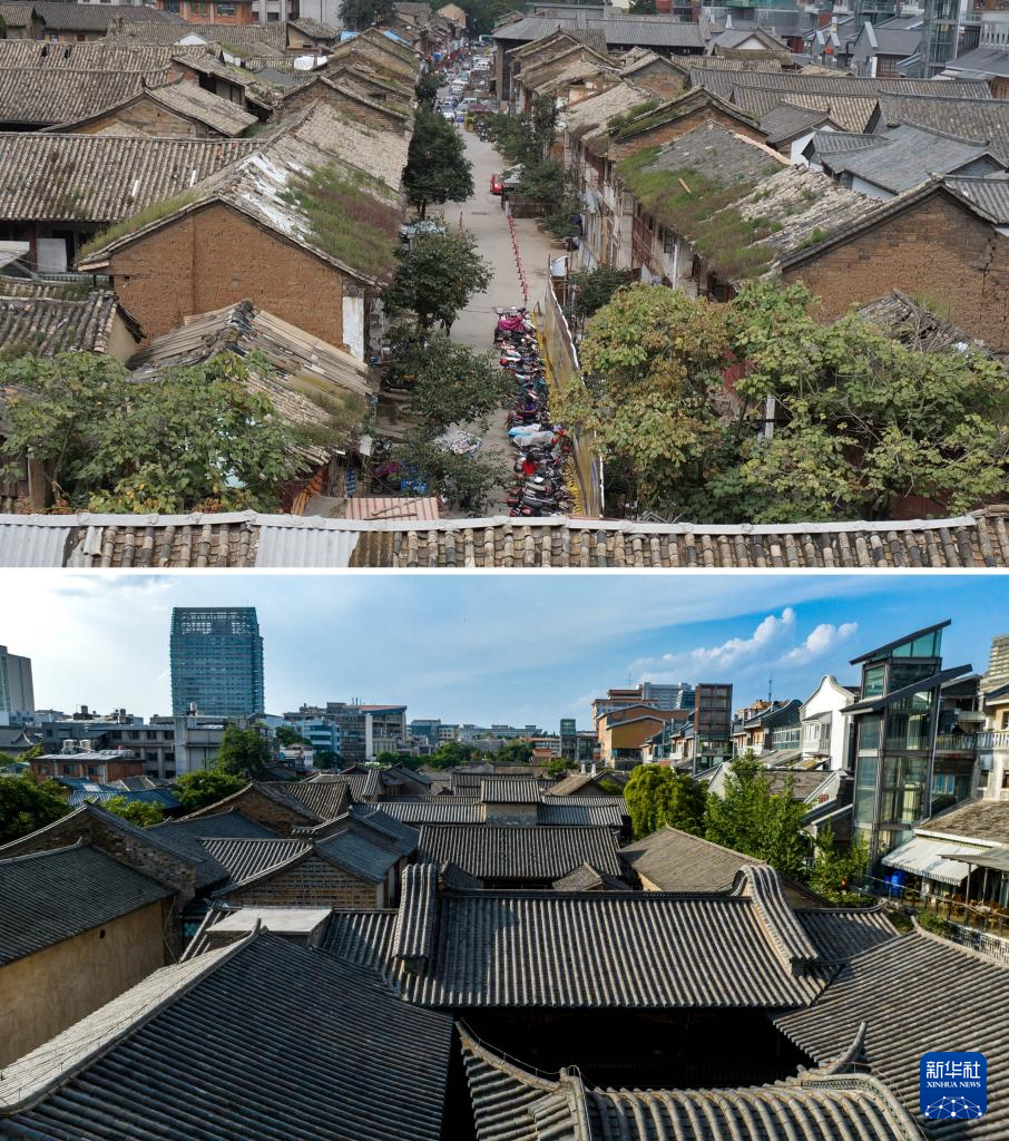 拼版照片:上图是修缮前的昆明老街(资料照片,新华社发陈忆秋摄);下图是5月13日拍摄的昆明老街(无人机照片,新华社记者胡超摄)。新华社发