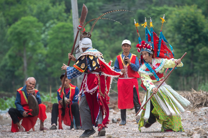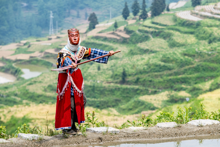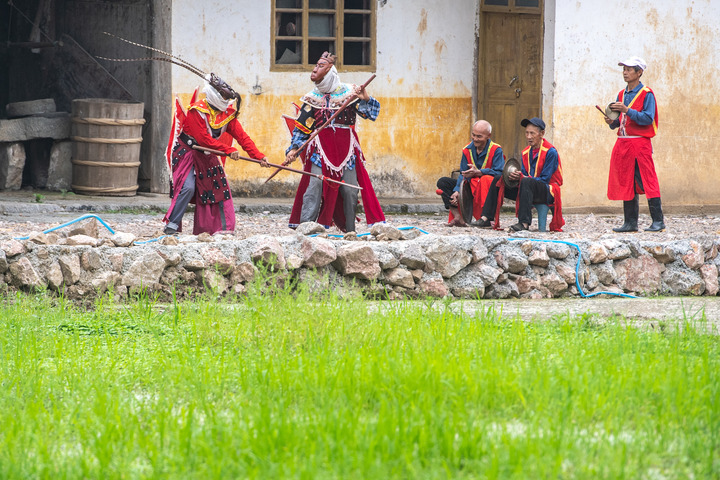 又是一年武陵山间水稻插秧季。在重庆市酉阳土家族苗族自治县铜鼓镇清泉村,水稻田间时时回响着极具地方特色的戏曲唱段,一群特别的非遗技艺阳戏(酉阳土家面具阳戏)表演者,往来于田间地头。他们忙时翻土培秧,准备着水稻插秧,闲时则舞枪弄剑,排演着表演剧目。