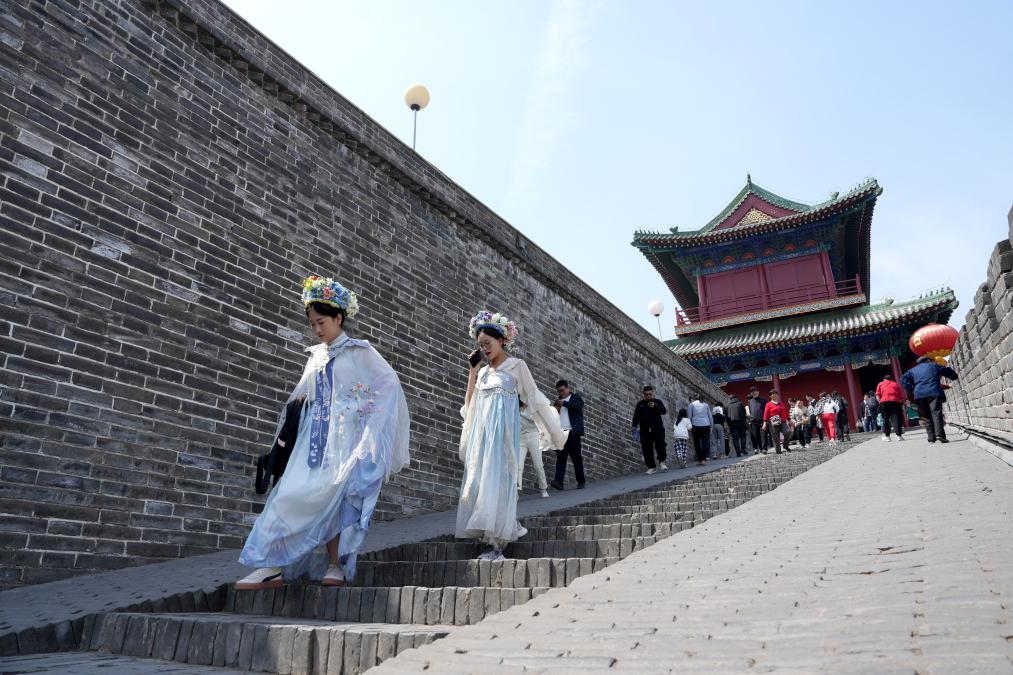 游客在河北正定南城门游玩。(梁子栋摄)
