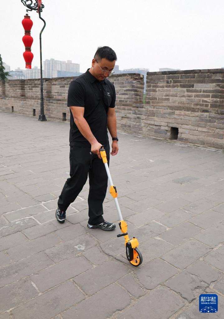 文保巡查员在西安城墙上测量海墁裂缝长度(2025年9月10日摄)。新华社记者 朱唯希 摄