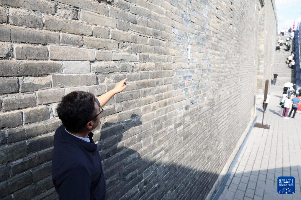 赵彬在介绍西安城墙永宁门上分布的传感监测设备的功能作用(2025年9月10日摄)。新华社记者 邵瑞 摄