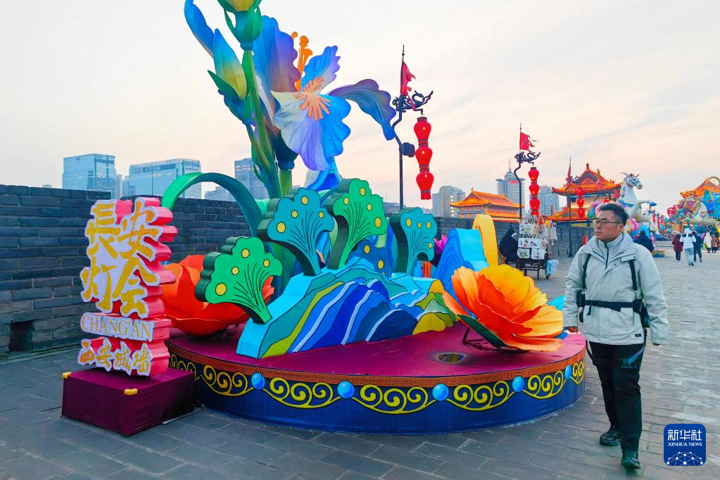 2026年1月4日,赵彬在西安城墙新年灯会期间带着城墙外骨骼机器人巡查。新华社发