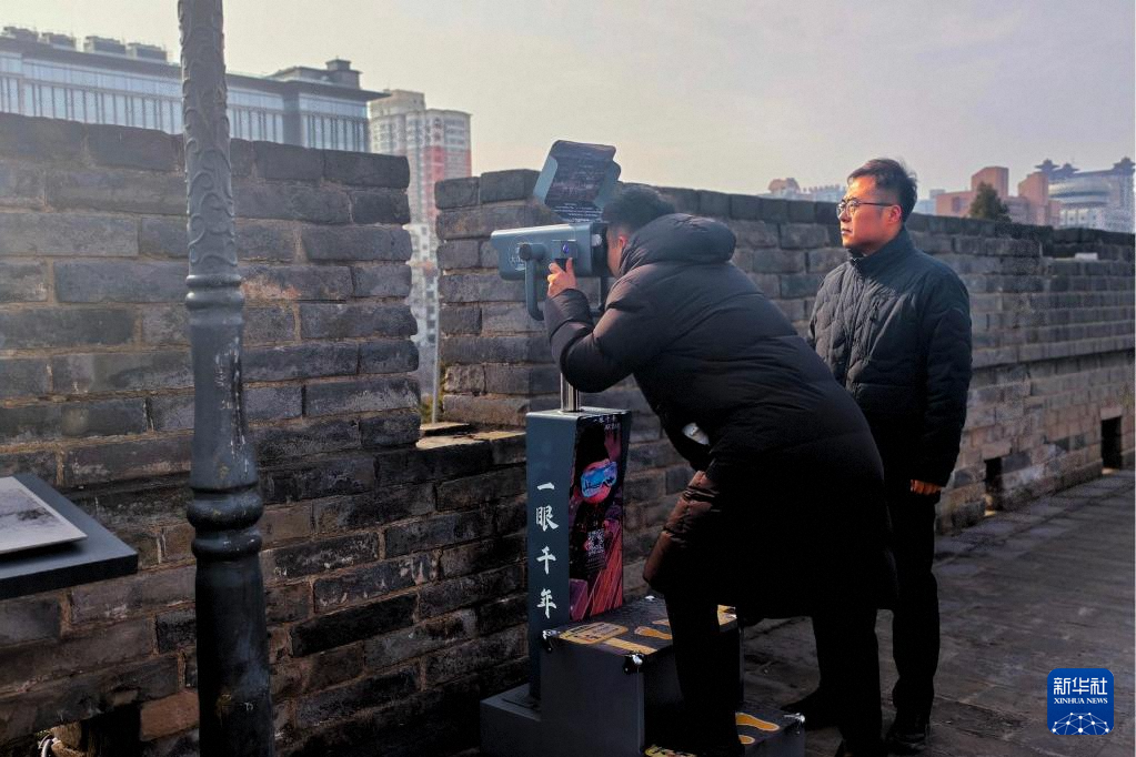 2026年1月5日,赵彬(右)在西安城墙上检查城墙的“一眼千年”AR望远镜设备。新华社发