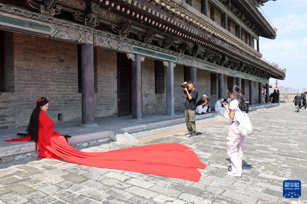 游客在西安城墙上拍摄艺术照(2025年9月12日摄)。新华社记者 朱唯希 摄
