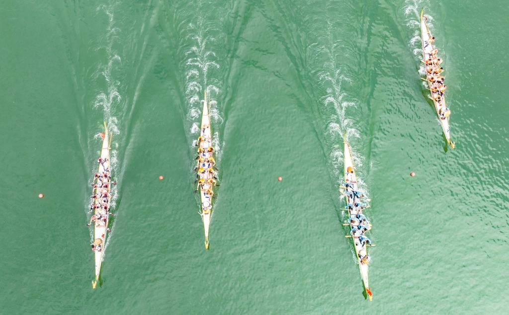 6月10日,湖北省宜昌市秭归县举办2024屈原故里传统龙舟赛,参赛选手在参加比赛(无人机照片)。新华社发(郑家裕摄)