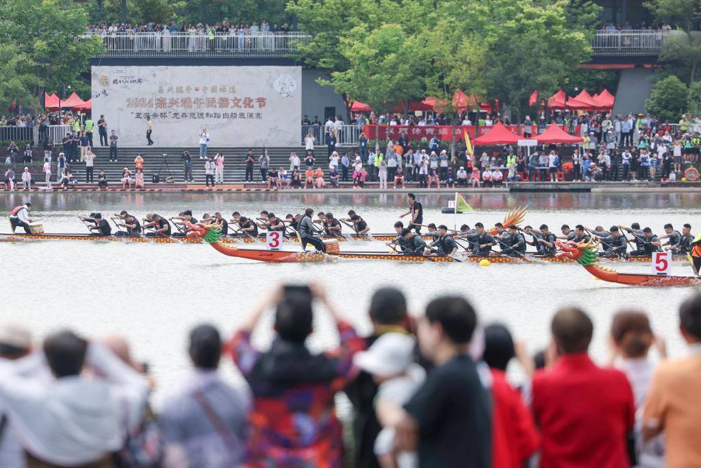 6月2日,浙江省嘉兴市南湖区西南湖水域,精彩的龙舟竞渡吸引市民观看。新华社发(徐志达摄)