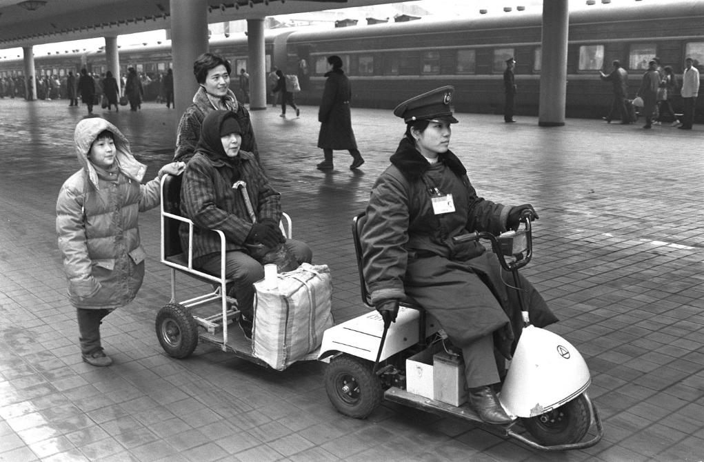 1994年1月30日,北京火车站客运员许新用电瓶车免费送旅客上车。新华社记者唐召明摄