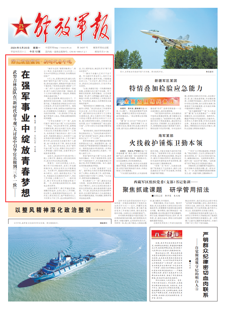 努力做到“三个一致”,激发官兵奋斗热情。该总队领导告诉记者,随着大讨论不断深入,官兵立足岗位成长成才的信念更加坚定,练兵备战热情日益高涨。不久前,该总队机动分队组织野外驻训,官兵紧盯制约战斗力生成的堵点难点问题研战谋战、专攻精练,取得多项训法战法成果。