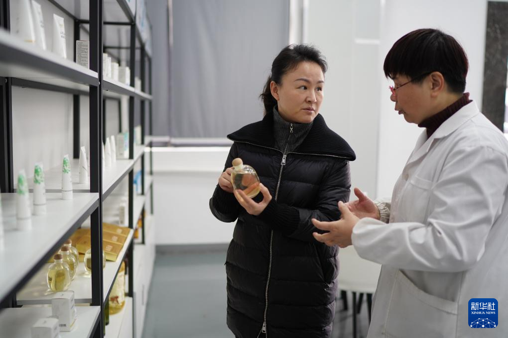 明经华(左)在位于江西赣州市章贡区的赣州哈克生物科技有限公司调研油茶深加工产业(2023年2月24日摄)。新华社记者 周密 摄