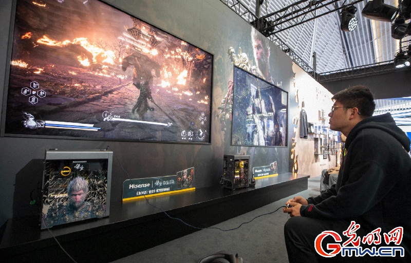 2025年11月6日,游戏科学展台上观众正专注体验由AI渲染优化的国产游戏《黑神话:悟空》。