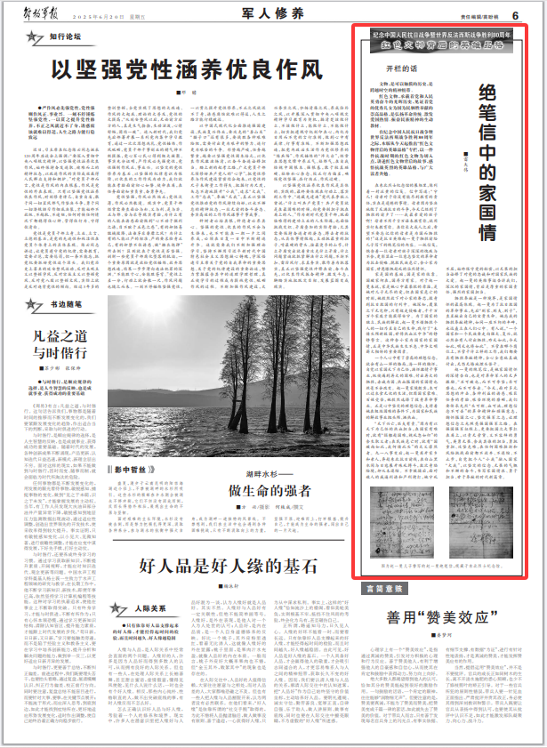 赵一曼的绝笔信,是她家国情怀的深情告白,也是对革命军人的无声激励。“石可破也,而不可夺坚;丹可磨也,而不可夺赤。”今天,面对多元思想的冲击、各种利益的诱惑、艰巨任务的考验、艰苦环境的磨砺,我们要传承先烈“头可断、血可流,理想信念不可丢”的革命精神和顽强意志,胸怀报国之心、坚定强军之志,让理想信念之光照亮强国强军之路。在强国强军征程上,更要把国之大事扛在肩上,以责无旁贷、义不容辞的勇气,英勇无畏、舍我其谁的担当,勇挑重担、攻坚克难,在任何困难挫折和风险挑战面前都不放弃、不退缩、不止步,自觉把个人“小我”融入国家“大我”,以坚定的信念、无畏的气概和不懈的奋斗,书写家国情浓、勇于担当、甘于奉献的时代新篇章。