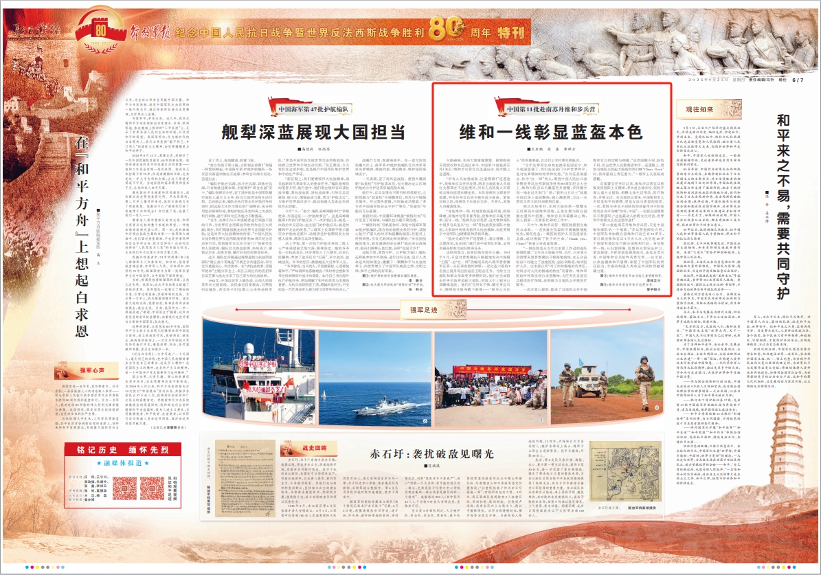 “当年先辈用生命热血换来祖国安宁,如今祖国富强了,我们走出国门守护世界和平,是对先辈精神的传承和发扬。”女兵任美娟感言,作为“红一师”传人,看到中国人民抗日战争暨世界反法西斯战争胜利80周年纪念大会上,维和方队官兵头戴蓝色贝雷帽、步伐整齐划一地走过天安门广场,“狼牙山五壮士”战旗在阅兵场上高高飘扬,她心潮澎湃,为这一光荣而又伟大的时刻感到自豪。