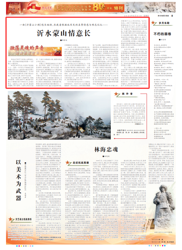 “人人(那个)都说(哎)沂蒙山好,沂蒙(那个)山上(哎)好风光。”这片红色热土,孕育了无数英雄儿女。在当时根据地420万人口中,有120万人拥军支前,20多万人参军,10多万人血染疆场。“沂蒙母亲”用慈母情怀抚育烈士遗孤,“红嫂”用乳汁救治负伤的小战士,更有无数沂蒙人民不分昼夜地救治伤员、抬运弹药、制作军粮。沂水蒙山间,革命军民生死相依、患难与共,谱写了一曲党群同心、军民情深、水乳交融、生死与共的赞歌。《沂蒙山小调》承载着根据地军民的真挚情感与难忘记忆,从沂水蒙山传唱至大江南北;从战争年代一直到今天,经久流传。