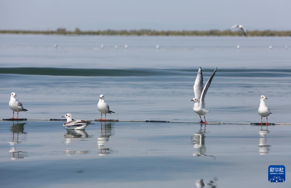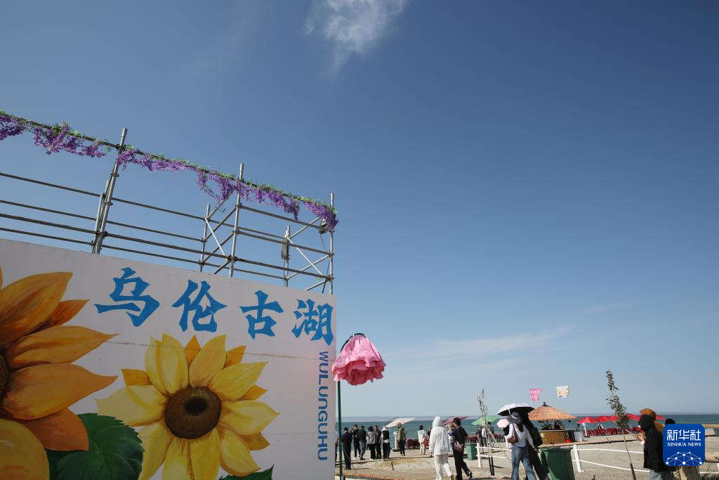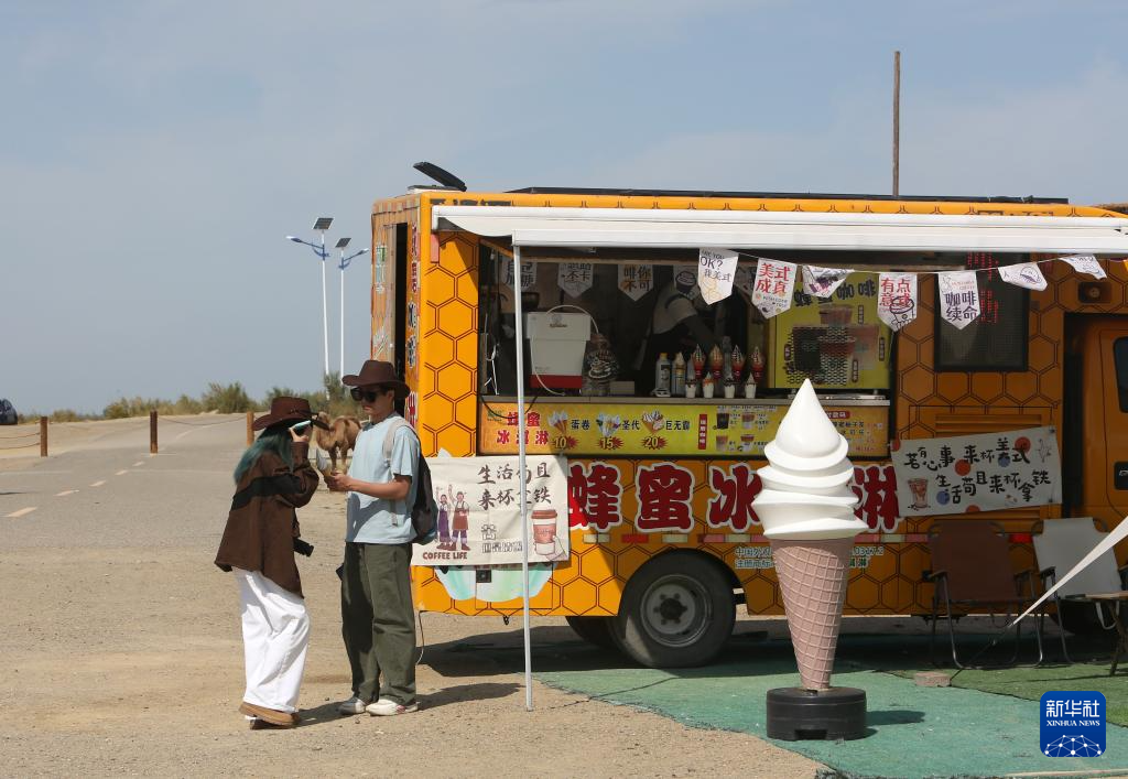 9月8日,游客在新疆阿勒泰地区福海县乌伦古湖金沙滩景区游玩。新华社记者 程丽 摄