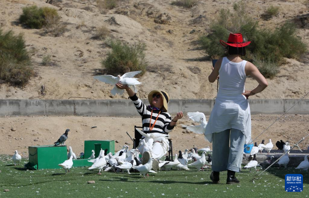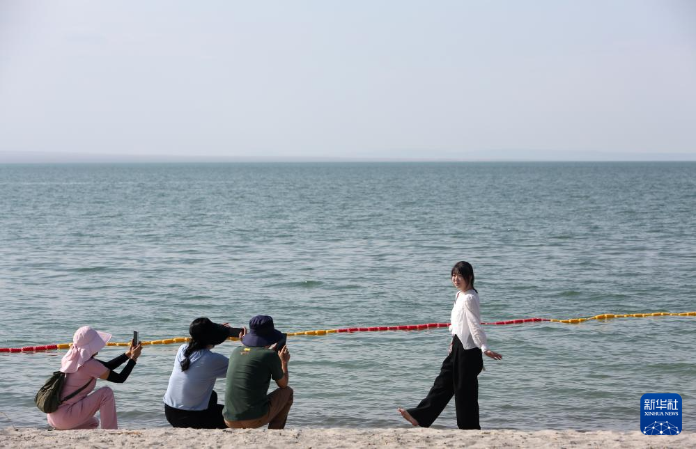 9月8日,游客在新疆阿勒泰地区福海县乌伦古湖金沙滩景区拍照。新华社记者 程丽 摄
