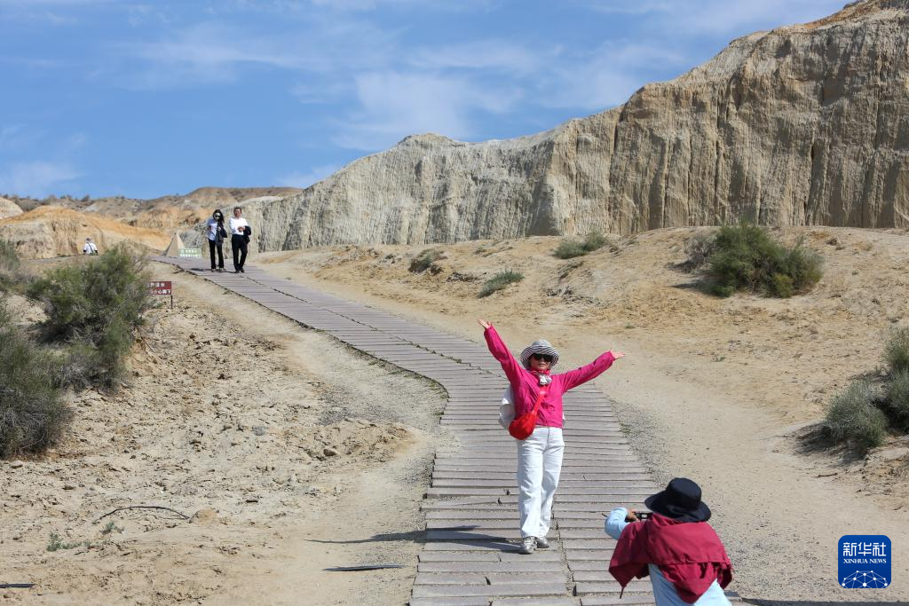 9月8日,游客在新疆阿勒泰地区福海县乌伦古湖海上魔鬼城景区游玩。新华社记者 程丽 摄
