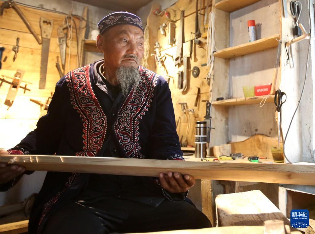 9月9日,在新疆阿勒泰“古老毛皮滑雪板制作技艺”传习基地,斯兰别克·沙和什制作毛皮滑雪板。