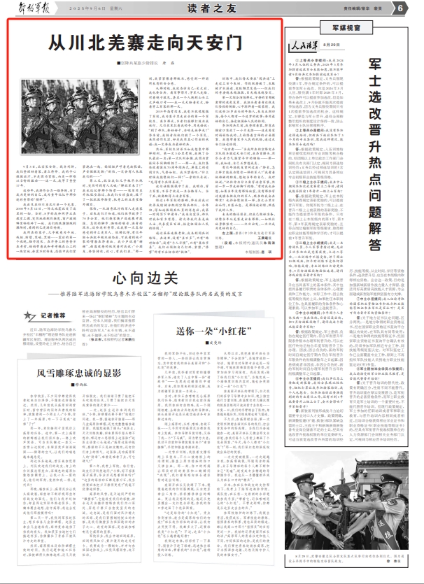 有位年轻战友曾问过我:“排长,怎么样才能成为像你一样的军人?”我看着他稚嫩的脸庞,想起当年的自己。我对他说:“记住你为什么要穿这身军装,然后一步一步走好脚下的路。”有时我也会想,如果当年没有那场地震,没有那些穿过废墟来救我们的军人,现在的我会在哪里?也许会像祖辈一样,在大山里日出而作,日落而息。是那抹迷彩绿,照亮了我的人生。