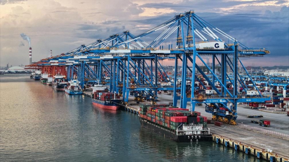 2025年9月16日,海轮在钦州港码头装卸货物(无人机照片)。新华社记者 张爱林 摄