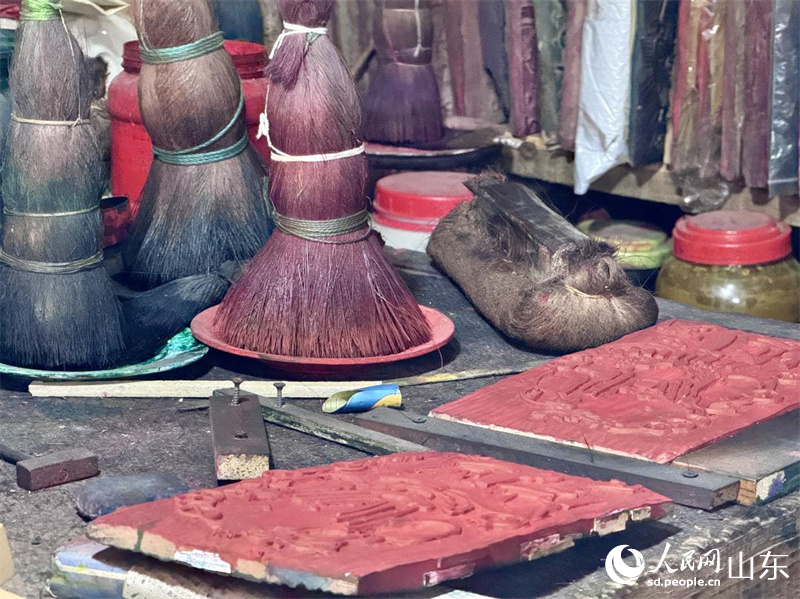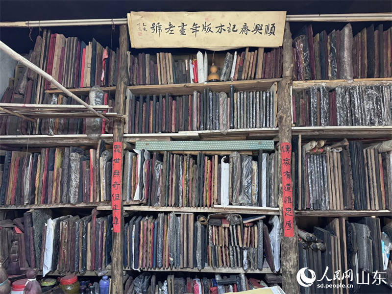 一间农村小屋里,一块“顺兴齐记”的木质招牌颇有年代感,牌匾下整齐码放的数百张大小不一的木版占据了一整面墙,桌面上则陈列着绘色的毛笔颜料、蜡垫子、木打锤、打刀子等印制与刻版工具,空气中弥漫着墨香与木香。这里,就是木版年画“顺兴齐记”的第六代传人——齐传新日常工作和生活的地方。