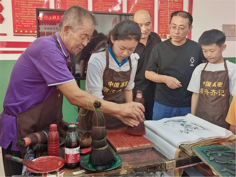 学生们正在体验套印年画。潍坊高密市夏庄镇宣传办供图
