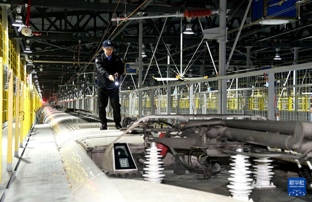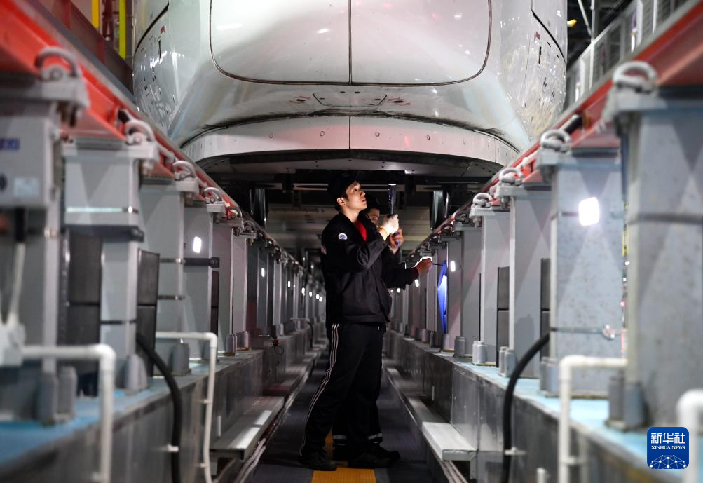 1月15日晚,中国铁路北京局集团有限公司天津动车客车段廊坊动车运用所检修库内灯火通明,机械师们连夜进行检查、测试、维修工作,保障动车运行安全。