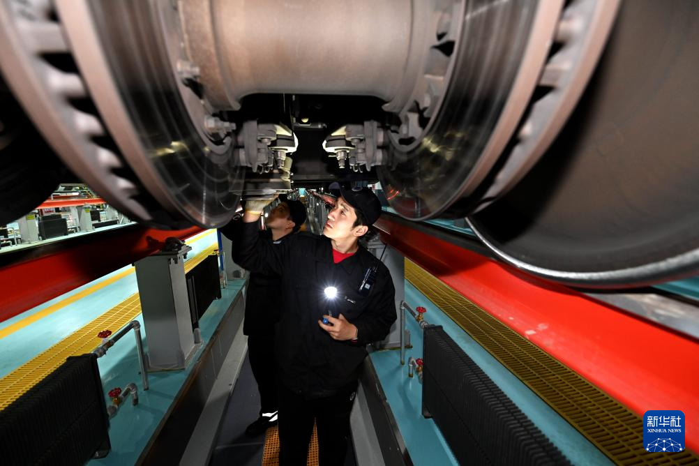 1月15日,动车机械师对动车底部进行检查。