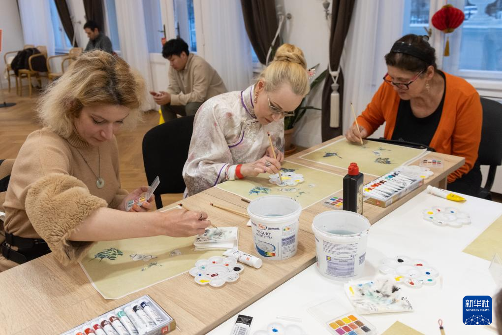 1月17日,在匈牙利布达佩斯,人们在“指尖上的非遗——中国文化体验日”为主题的2025“欢乐春节”活动上体验中国绘画。